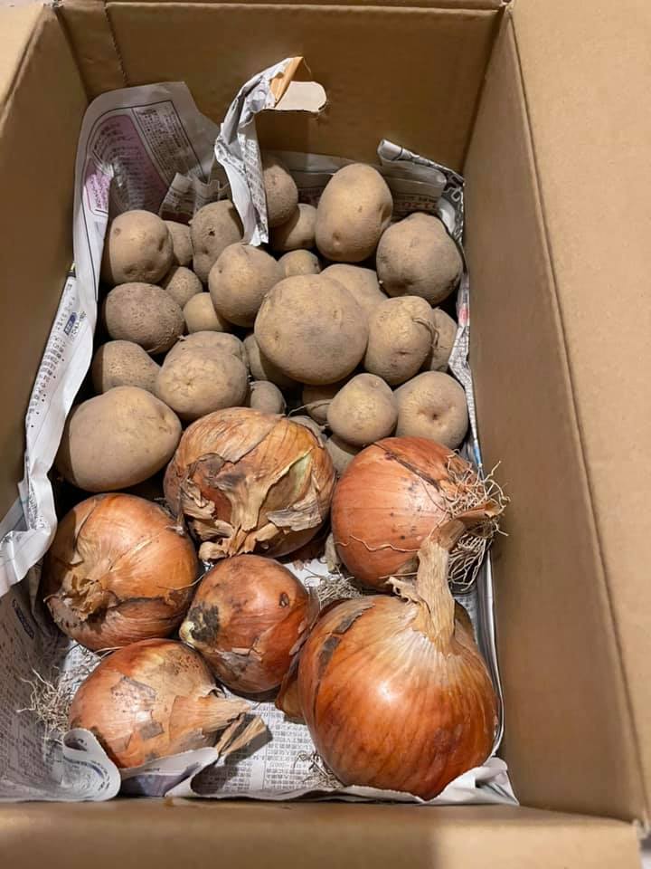 収穫したてのジャガイモと玉ねぎが、